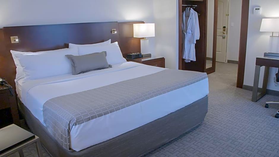 This room has views of Confederation Park. Amenities include free WiFi and local calls. The room also contains a mini-fridge, in-room safe and Keurig coffee maker. The bathroom has marble tiles.
